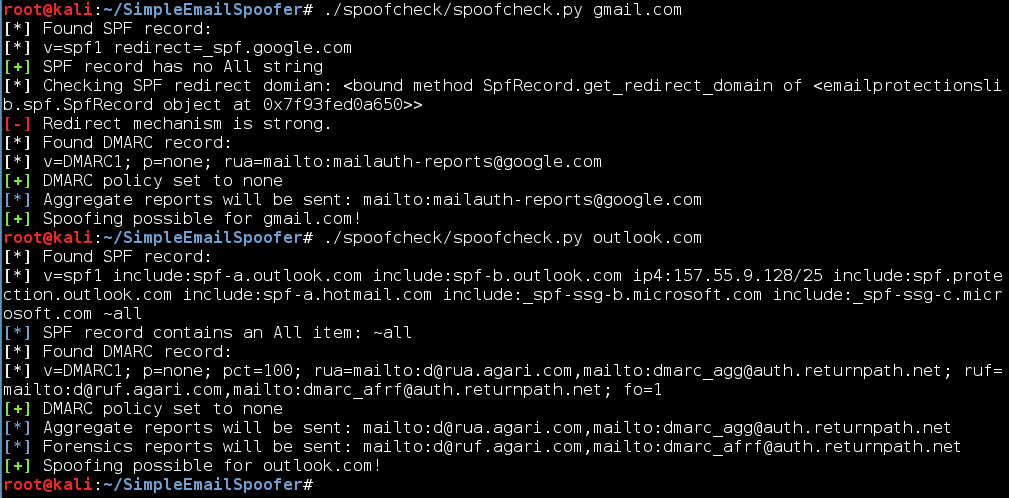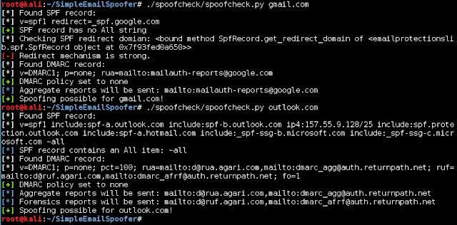 De este par de herramientas la que realmente he visto más útil, quizá por sencillez es la de SpoofCheck. Esta herramienta permite verificar una serie de condiciones para demostrar si un dominio es spoofeable o no. Es decir, la herramienta nos dirá si el dominio que se quiere suplantar es, probablemente, spoofeable o, si por el contrario, deberíamos buscar otro tipo de vía. Por otro lado, la herramienta SimpleEmailSpoofer es un script escrito en Python que se encarga de conectar con Postfix y llevar a cabo el envío del email, con los parámetros y atributos que le indiquemos a la aplicación.